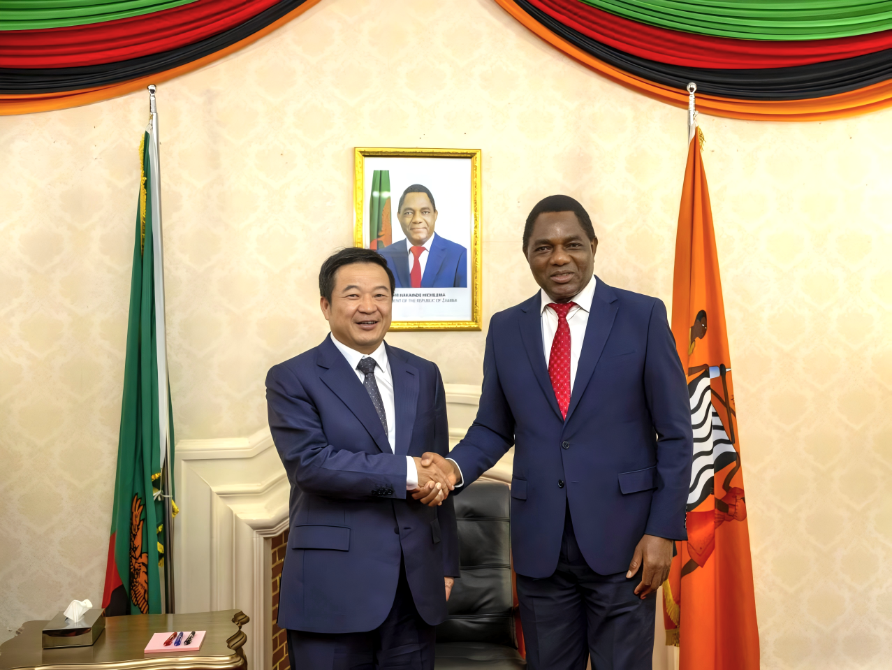 當(dāng)?shù)貢r(shí)間11月12日,正在贊比亞調(diào)研的中國(guó)有色集團(tuán)董事長(zhǎng)文崗在盧薩卡拜會(huì)贊比亞總統(tǒng)哈凱恩德·希奇萊馬。這是繼9月3日在北京會(huì)談后,文崗與希奇萊馬總統(tǒng)的第二次會(huì)面,體現(xiàn)了中國(guó)有色集團(tuán)積極響應(yīng)習(xí)近平主席同希奇萊馬總統(tǒng)就中贊建交60周年互致賀電精神,全面落實(shí)中非合作論壇成果,深化踐行“一帶一路”倡議,持續(xù)加大在贊投資力度,深化在礦業(yè)領(lǐng)域的各類(lèi)合作,為發(fā)展新時(shí)代中贊全天候友誼貢獻(xiàn)力量。