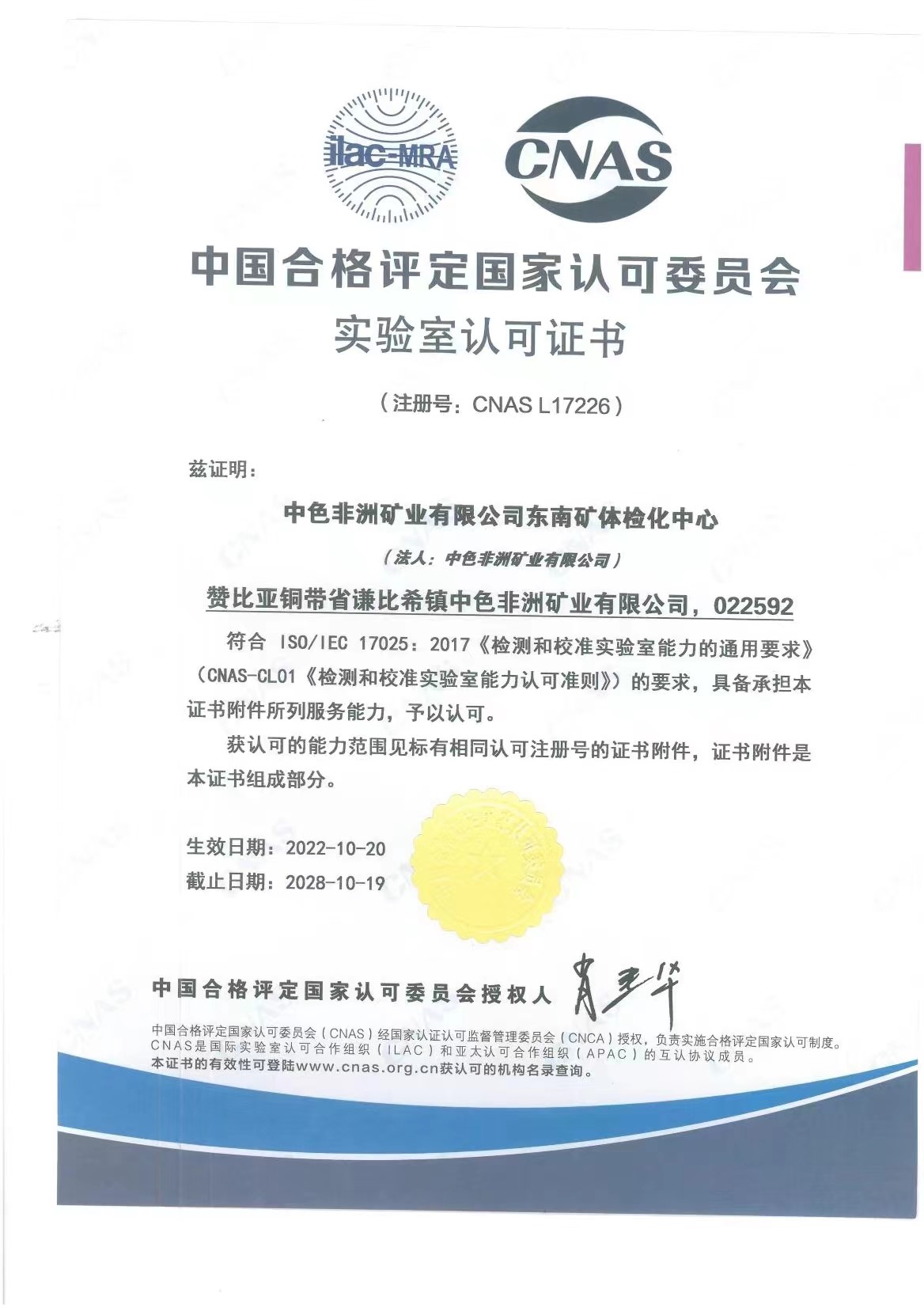 近日,中國(guó)有色集團(tuán)國(guó)際研發(fā)中心贊比亞實(shí)驗(yàn)室(簡(jiǎn)稱:贊比亞實(shí)驗(yàn)室)通過中國(guó)合格評(píng)定國(guó)家認(rèn)可委員會(huì)評(píng)定,授予檢測(cè)實(shí)驗(yàn)室認(rèn)可資格和ILAC-MRA、CNAS聯(lián)合標(biāo)識(shí),標(biāo)志著贊比亞實(shí)驗(yàn)室在銅、鈷領(lǐng)域的檢測(cè)能力得到ILAC-MRA國(guó)際互認(rèn)、獲得國(guó)家CNAS權(quán)威認(rèn)可。