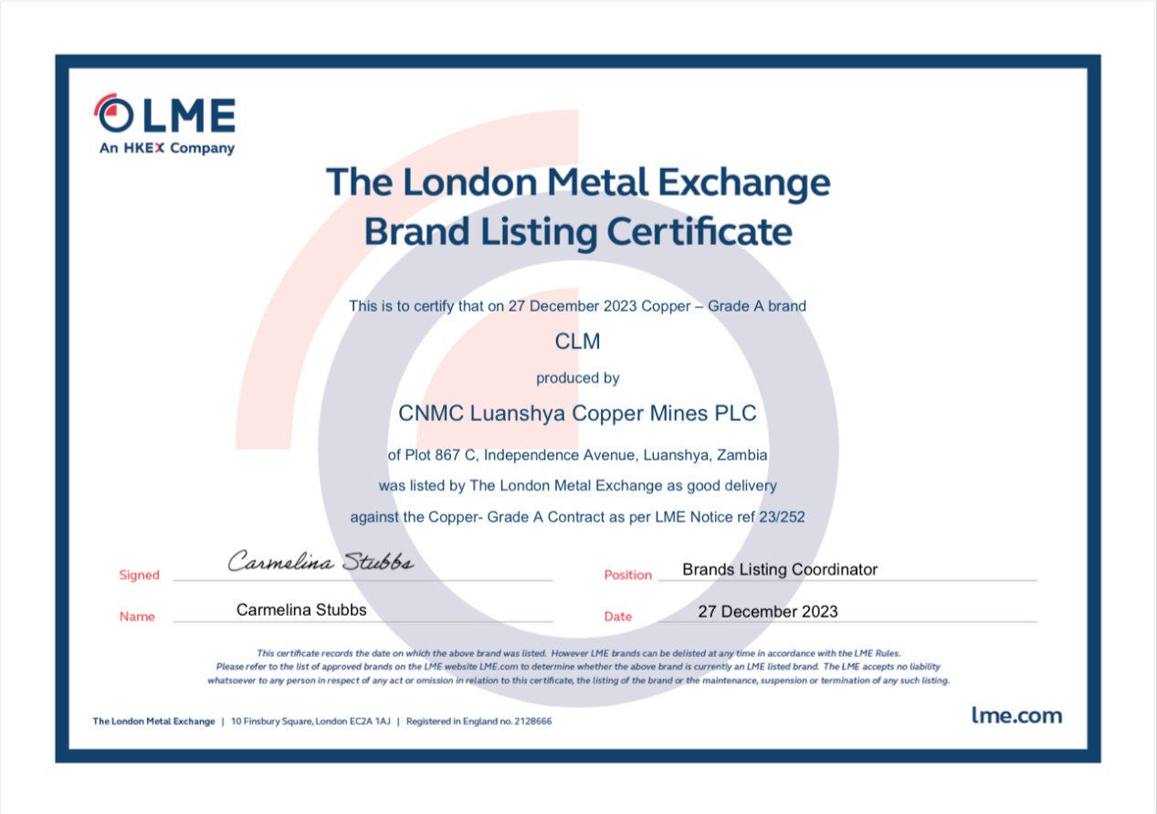 2023年12月27日,倫敦金屬交易所(LME)發(fā)布通告,中國有色集團在贊比亞出資企業(yè)中色盧安夏銅業(yè)有限公司(簡稱:中色盧安夏)生產的“CLM”牌A級陰極銅正式進入LME注冊牌號清單之列。