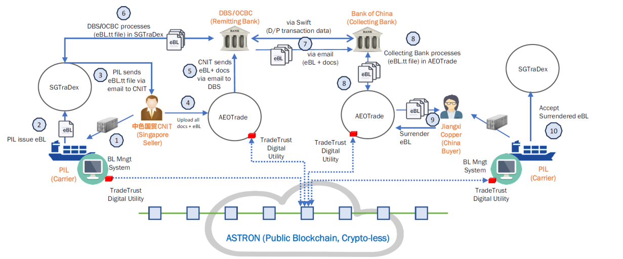 二是驗(yàn)證可行性,掌握電子提單“試金石”。驗(yàn)證了電子提單在銅產(chǎn)品貿(mào)易中的可行性,通過基于信貿(mào)鏈和TradeTrust的平臺(tái)進(jìn)行單據(jù)真實(shí)性核驗(yàn),代收行通過平臺(tái)直接驗(yàn)單,并能夠在線進(jìn)行權(quán)屬轉(zhuǎn)移,顯著提升跨境貿(mào)易融資安全性與效率。