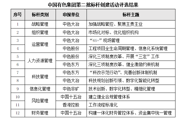 為進一步貫徹落實國企改革三年行動部署要求,指導(dǎo)推動出資企業(yè)鞏固提升改革成效,中國有色集團對照國資委對標世界一流管理提升行動要求,組織開展了第二批管理提升典型標桿創(chuàng)建活動,圍繞戰(zhàn)略管理、組織管理、運營管理、人力資源管理、科技管理、信息化管理、風(fēng)險管理、財務(wù)管理八個方面評選12項典型標桿,并予發(fā)布。
