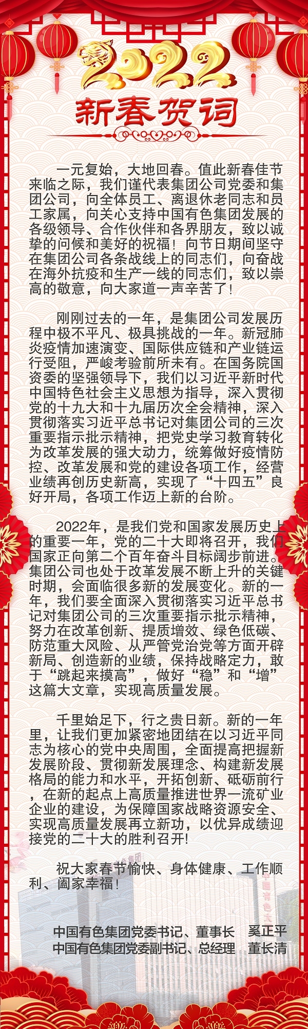 中國有色集團是我國有色金屬工業(yè)最早實施“走出去”戰(zhàn)略、國際化經營成果最豐碩的企業(yè)之一,位居“中國企業(yè)全球化50強”第18位,榮獲全國“五一”勞動獎狀、感動非洲的十大中國企業(yè)、中國有色金屬工業(yè)境外資源開發(fā)戰(zhàn)略功勛企業(yè)等稱號。