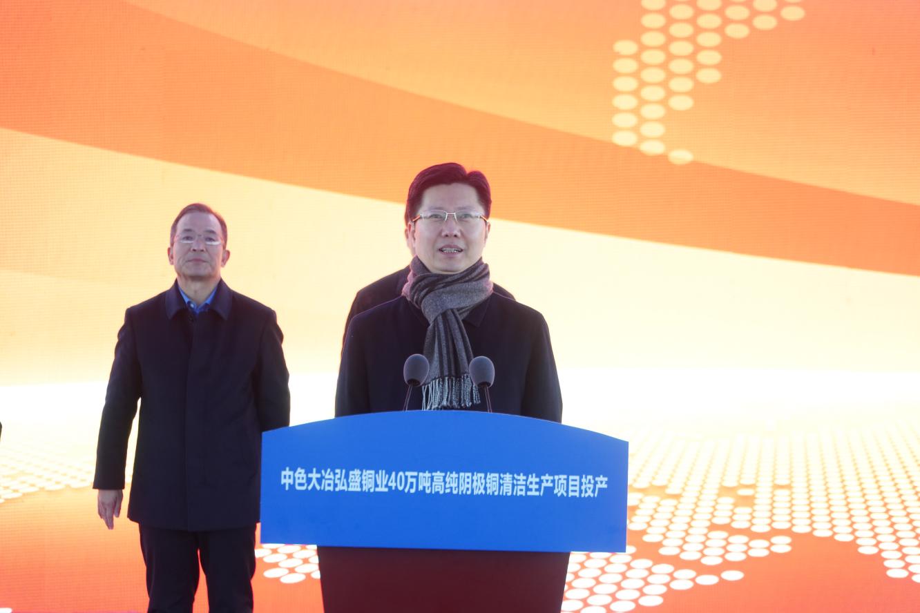 2月14日,中色大冶弘盛銅業(yè)40萬噸高純陰極銅清潔生產(chǎn)項(xiàng)目舉行投產(chǎn)活動。中國有色集團(tuán)黨委書記、董事長奚正平講話并頒發(fā)項(xiàng)目建設(shè)特別獎(jiǎng)。黃石市委書記郄英才現(xiàn)場宣布項(xiàng)目正式投產(chǎn)。黃石市委副書記、市長吳之凌講話。黃石新港(物流)工業(yè)園區(qū)黨工委書記程艷民作表態(tài)發(fā)言。中國有色集團(tuán)副總經(jīng)理、中色大冶董事長王焱致辭?;顒佑芍袊猩瘓F(tuán)黨委副書記、總經(jīng)理張晉軍主持。