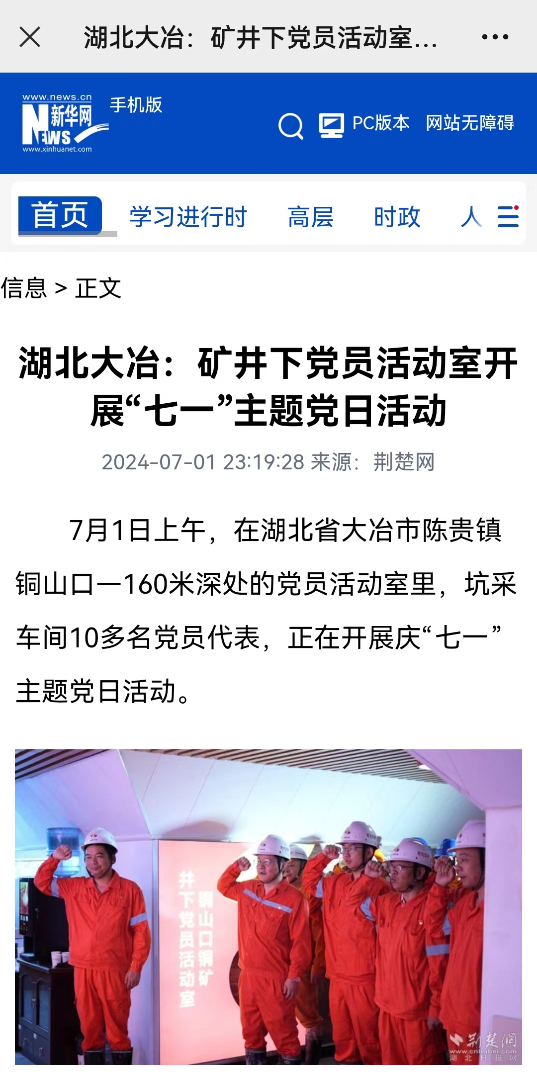 “7月1日上午,在湖北省大冶市陳貴鎮(zhèn)銅山口礦-160米深處的黨員活動室里,坑采車間10多名黨員,正在開展慶‘七一’主題黨日活動。”這是2024年7月1日新華網(wǎng)(手機版),發(fā)布報道《湖北大冶:礦井下黨員活動室開展“七一”主題黨日活動》的內(nèi)容。