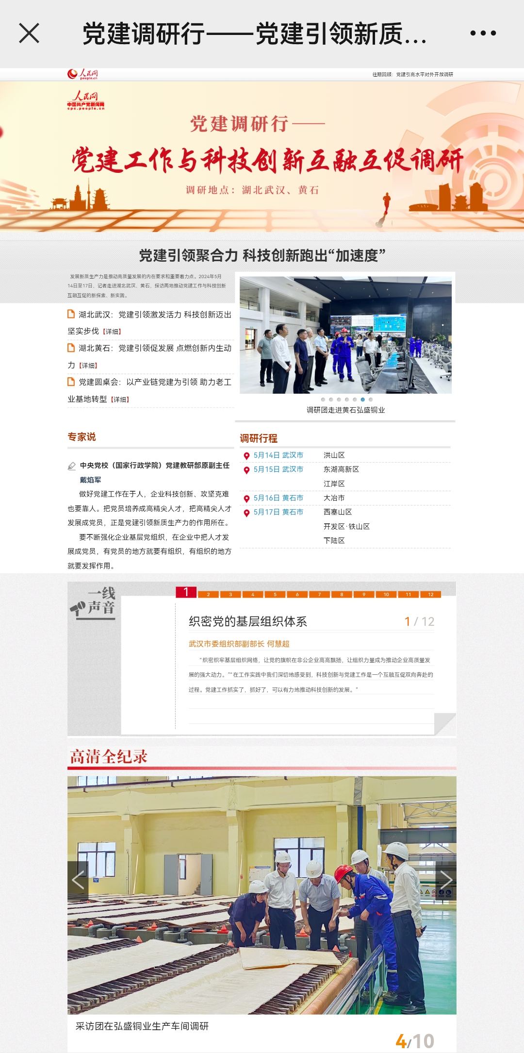 “弘盛銅業(yè)黨委堅持黨管干部、黨管人才原則,大力選拔培養(yǎng)人才,大力鍛造員工隊伍……”這是今年6月16日,人民網(wǎng)發(fā)布《湖北黃石:黨建引領(lǐng)促發(fā)展? 點燃創(chuàng)新內(nèi)生動力》的新聞報道中,專門介紹了公司的黨建經(jīng)驗。