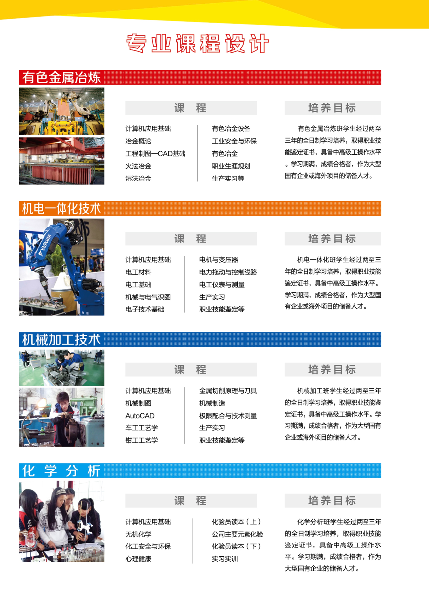 有色金屬冶煉、機(jī)電技術(shù)應(yīng)用、選礦技術(shù)、工業(yè)分析與檢驗(yàn)、機(jī)械加工技術(shù)