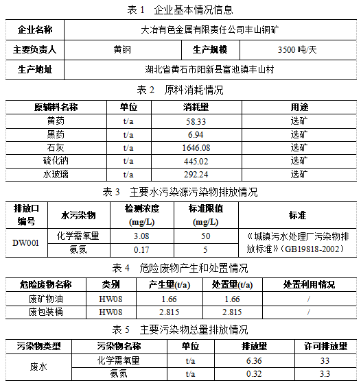 根據(jù)《中華人民共和國清潔生產(chǎn)促進法》、《清潔生產(chǎn)審核辦法》等相關(guān)文件規(guī)定,現(xiàn)將大冶有色金屬有限責任公司豐山銅礦清潔生產(chǎn)審核情況及2024年企業(yè)基本信息、污染物排放和總量控制情況公告如下,請社會各界對豐山銅礦實施清潔生產(chǎn)審核的情況進行監(jiān)督。