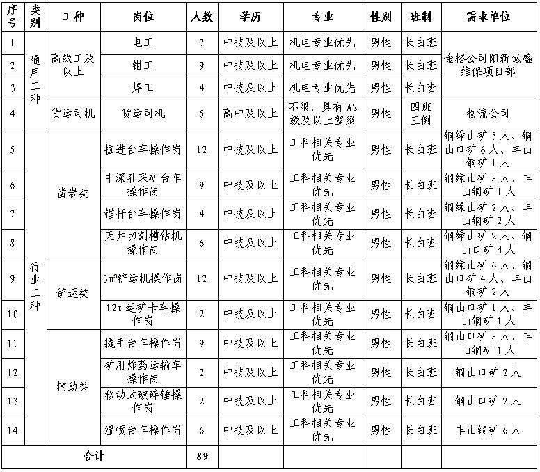 ????學(xué)歷年齡要求:技能人才年齡要求在30周歲以內(nèi),如有冶煉、礦山行業(yè)相關(guān)崗位工作經(jīng)驗(yàn)、對口崗位中級(jí)工及以上職業(yè)資格證書、大學(xué)本科及以上學(xué)歷或復(fù)退軍人,年齡可放寬至35周歲,原則上男性優(yōu)先。高級(jí)工及以上技能人才年齡要求原則上不超過40周歲,特別優(yōu)秀者年齡可放寬至45周歲。