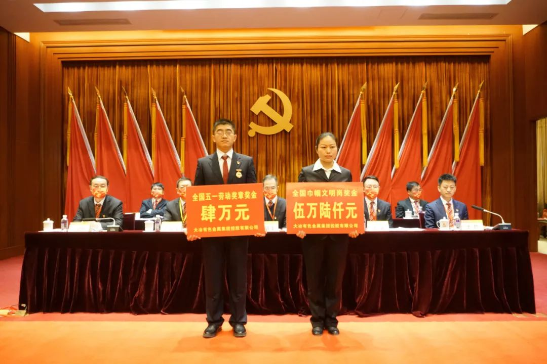 全國五一勞動獎?wù)芦@得者楊濤、全國巾幗文明崗銅綠山礦機運車間女子創(chuàng)新工作室代表上臺領(lǐng)獎