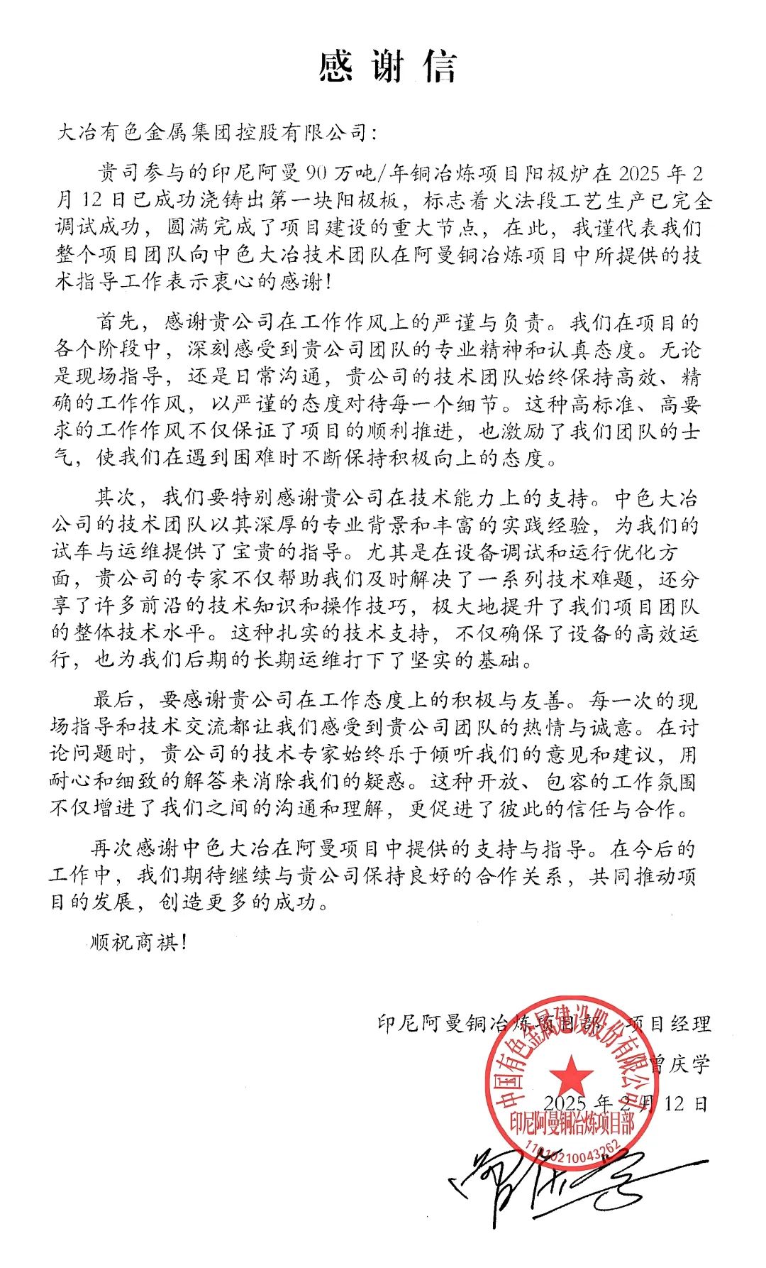 一封感謝信,既標(biāo)志著印尼阿曼銅冶煉項(xiàng)目建設(shè)取得了重大突破,也是對(duì)公司印尼阿曼項(xiàng)目部管理技術(shù)團(tuán)隊(duì)的肯定與贊揚(yáng),更是公司“走出去”實(shí)現(xiàn)合作共贏的一次成功實(shí)踐。